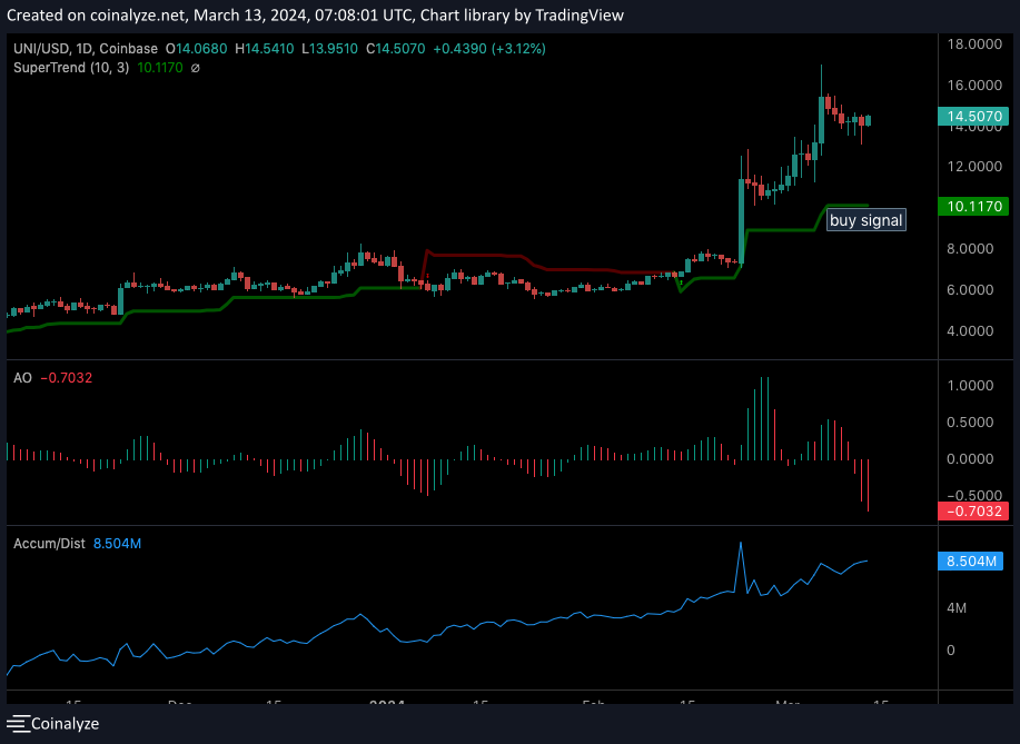 No momento da publicação, o preço do token era de US$ 14,51. No entanto, o acúmulo recente pode significar que algo está se formando e a UNI pode estar pronta para um rali.