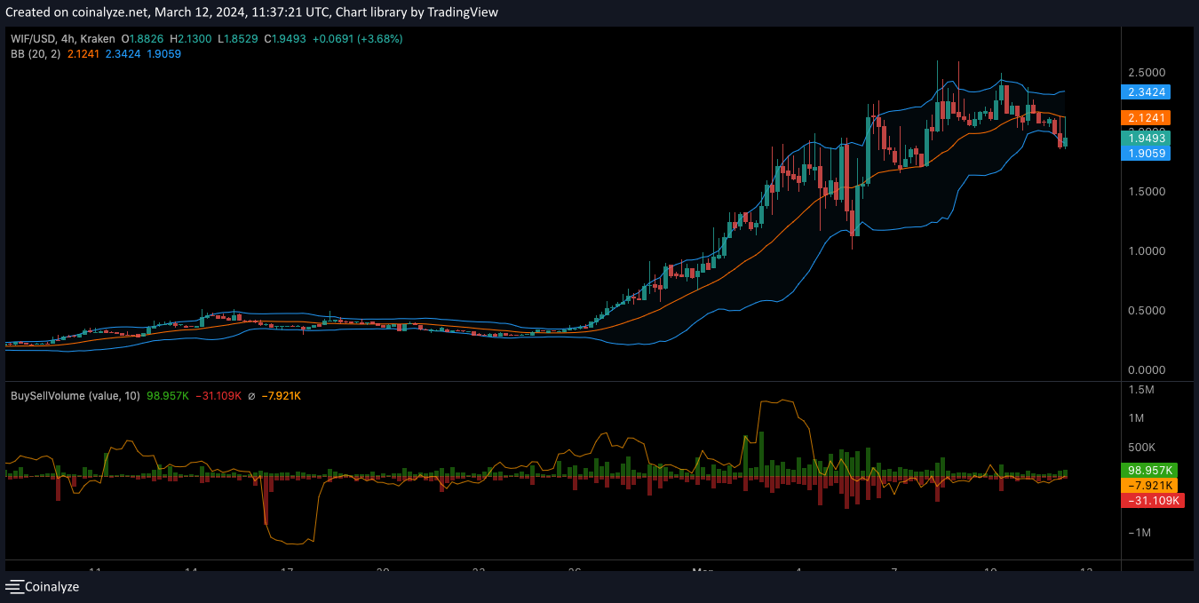 Assim como a BONK, o preço do WIF caiu quando a vela vermelha o forçou a cair para US$ 1,87. No entanto, o WIF pode ser capaz de testar novamente US$ 2 por causa das indicações do volume de compra/venda.