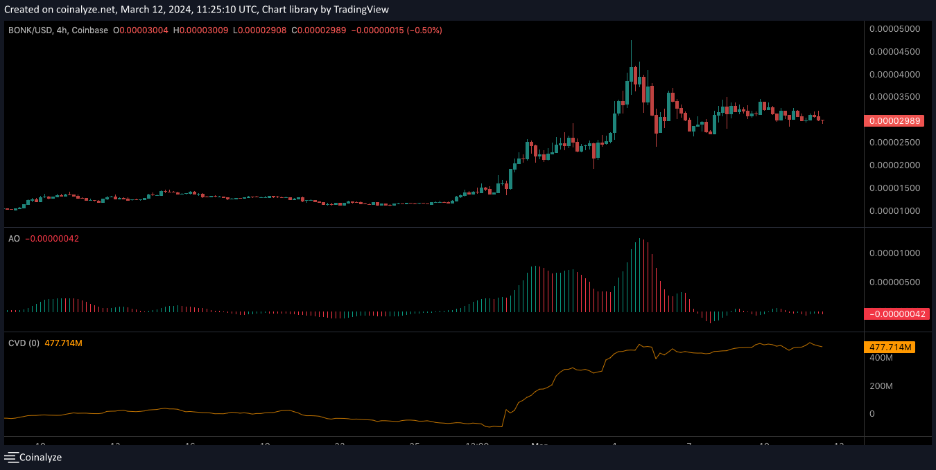 Mas uma coisa que a Coin Edition notou foi que o CVD estagnou. Portanto, o valor positivo pode ser resultado da pressão de compra vivida desde o início de março. Se o CVD subir mais, então BONK pode retestar $ 0,000039. Caso contrário, o valor pode diminuir.