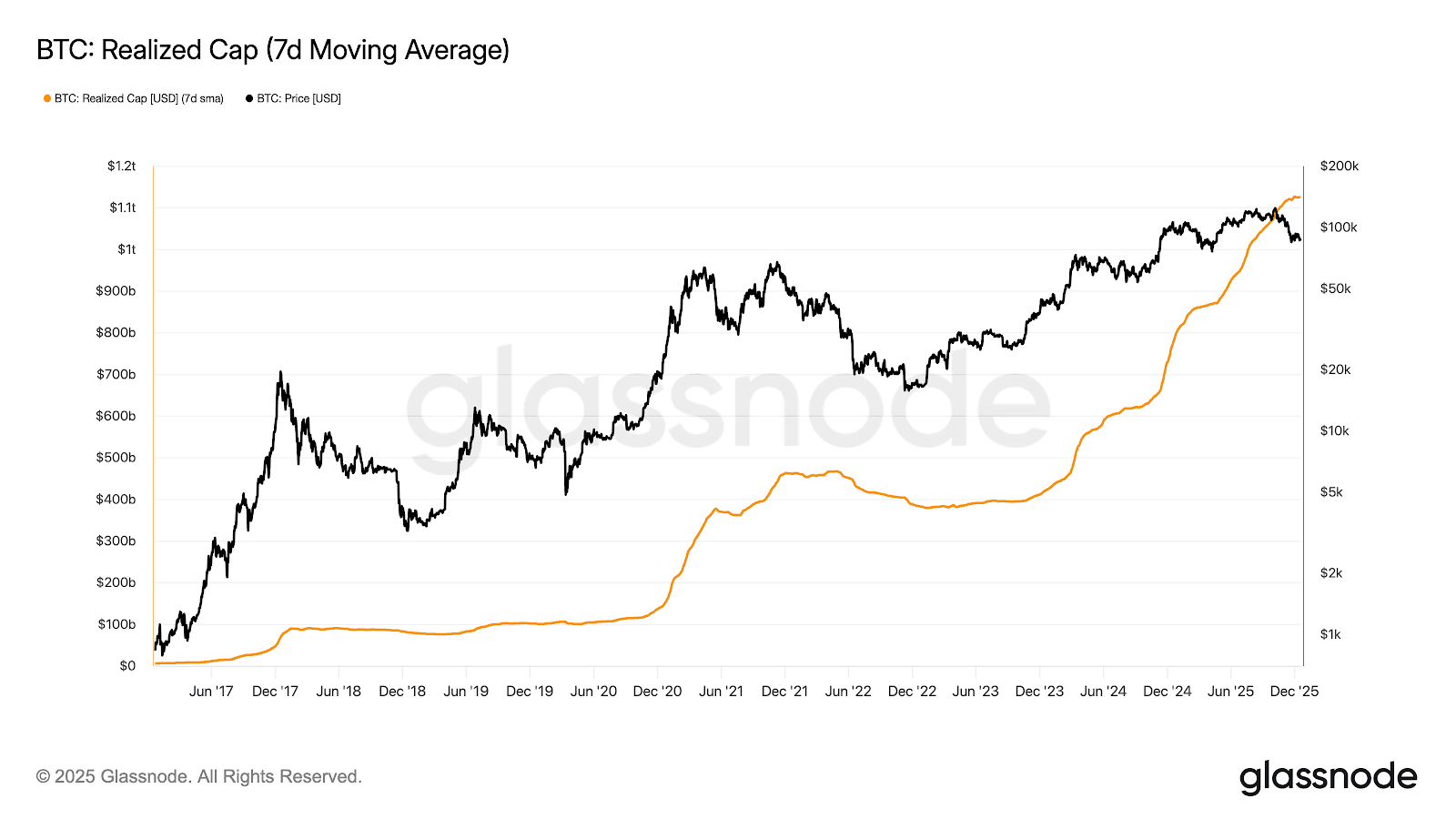 Apesar das oscilações de preço e dos fluxos mistos de ETFs, a perspectiva de longo prazo do Bitcoin parece sólida. Sua capitalização realizada, uma medida do valor das moedas em sua última transação, atingiu um recorde de US$ 1,125 trilhão, mostrando entradas de capital constantes.