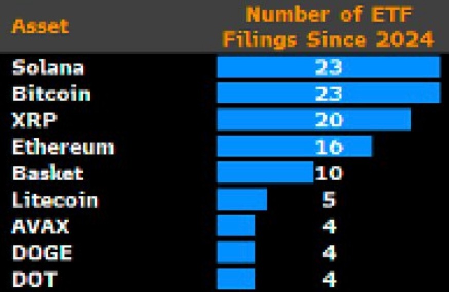 O Bitcoin tem um número semelhante de pedidos de ETF para Solana nos Estados Unidos. As aplicações do ETF XRP são 20 e as do Ethereum são 10.