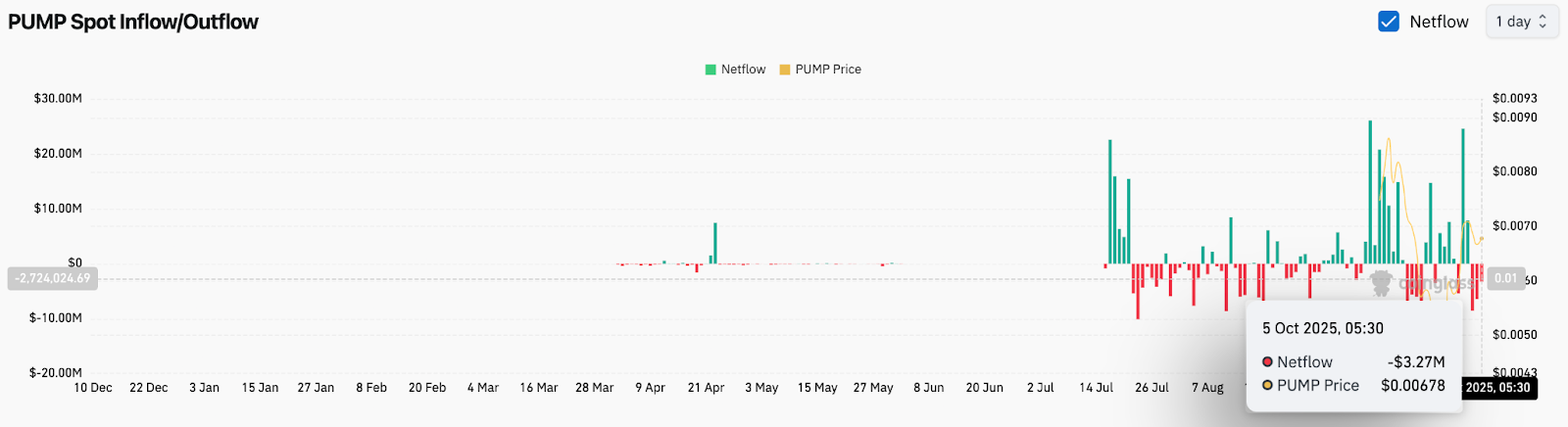 The persistence of red netflow bars through late September into October suggests that some speculative capital is rotating out after PUMP’s earlier spike. Sustained outflows above $2 million per day could limit further price expansion, especially if buyback activity slows in the near term.