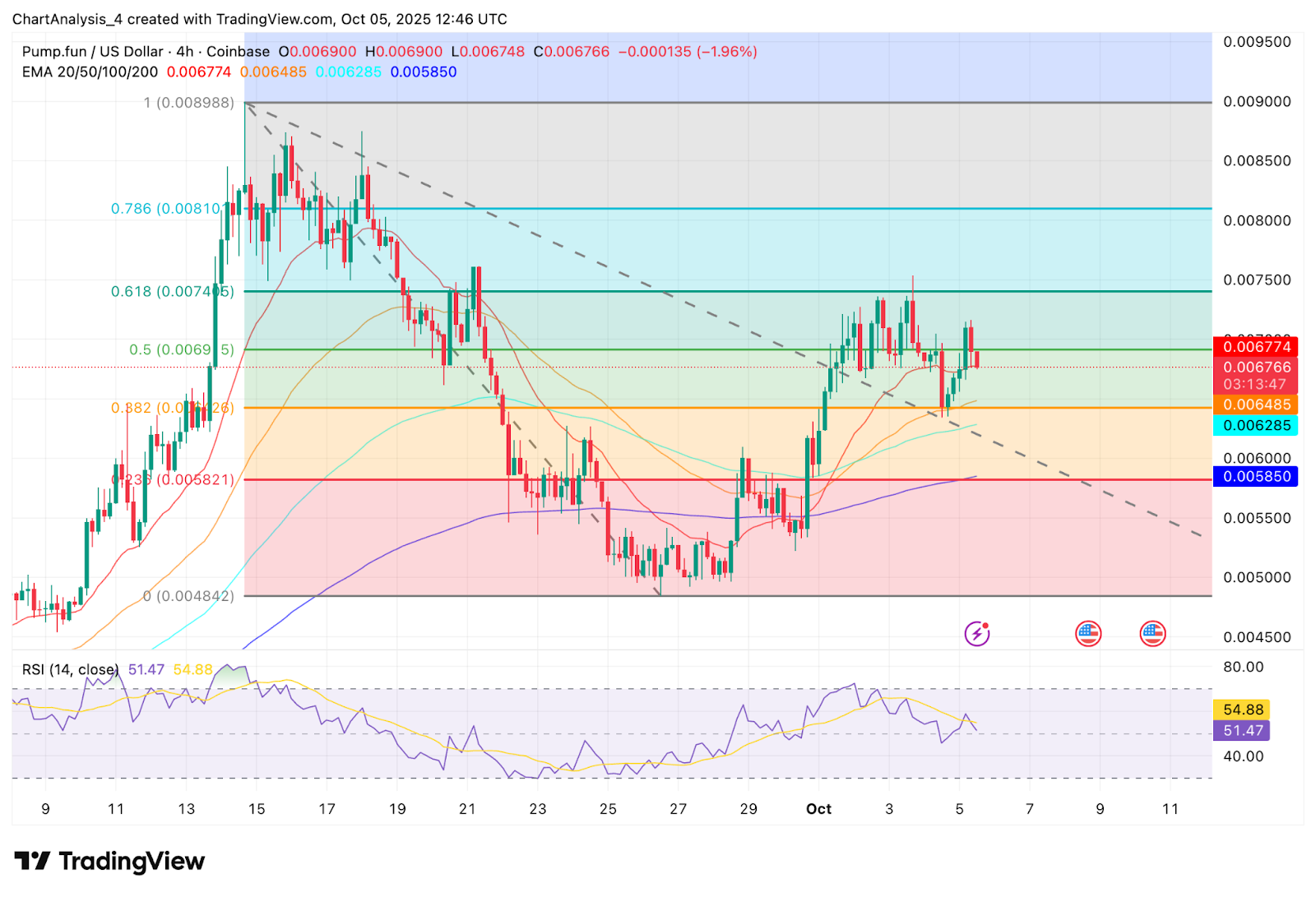 The 200-day EMA sits lower at $0.00585, forming a solid base for any deeper correction. RSI readings hover near 51.4, showing neutral momentum after cooling from near-overbought levels earlier in the week. If buyers fail to reclaim the $0.00745 zone, the risk of another retest toward $0.0060 grows, where the 50 EMA and the 0.382 retracement converge.