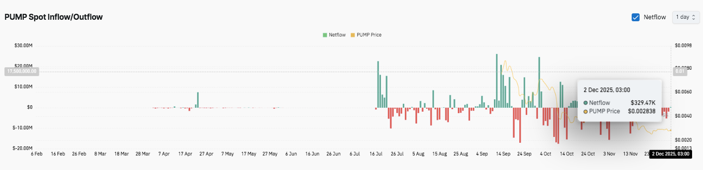 Spot flows confirm the broader tone. Inflows spiked in July and September, but sellers gained control from October onward. Repeated outflow prints showed consistent distribution. Besides that, inflows stayed brief and failed to shift momentum. The minor $329K positive print in December changed little as price drifted toward $0.002.