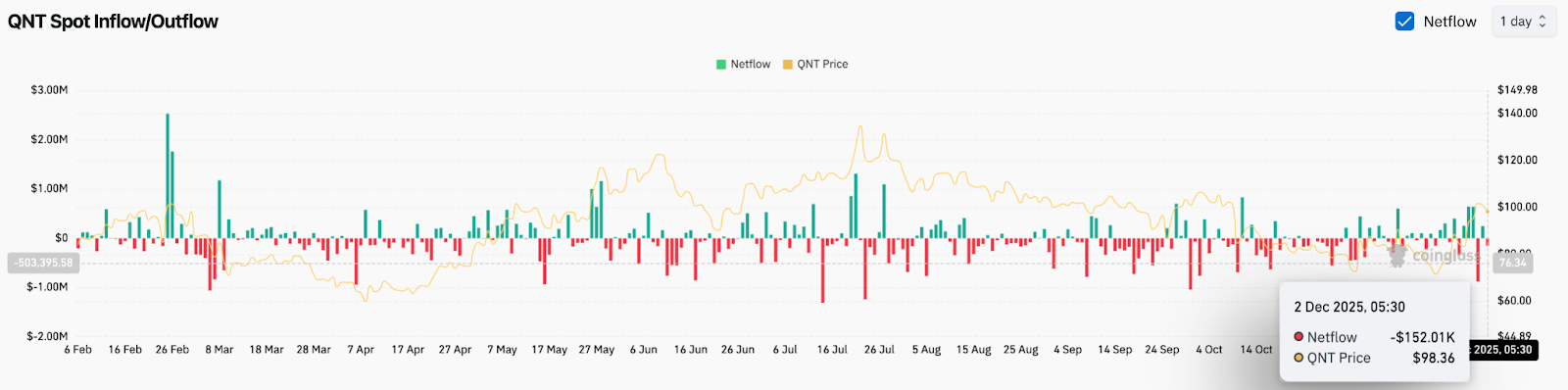 Over the past year, Quant has shown a tendency for outflows to accelerate near local peaks, and inflows to dominate during value accumulation. The current flow pattern sits between those extremes: not a panic exit, but not aggressive positioning either.
