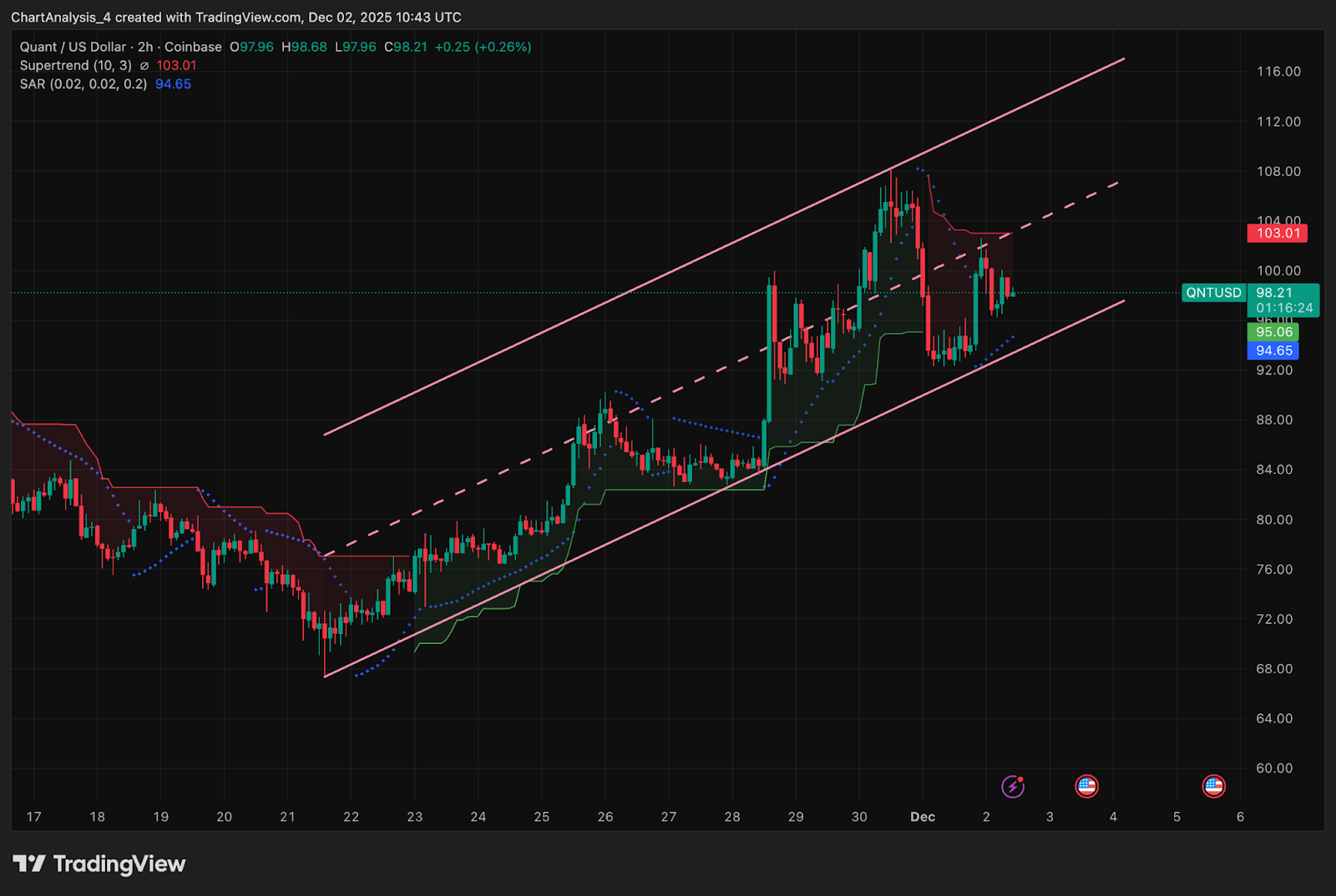 The Supertrend sits overhead at $103, acting as immediate resistance, while the upper channel line has rejected price repeatedly. The Parabolic SAR has flipped above price during pullbacks, signaling slowing momentum inside the channel.