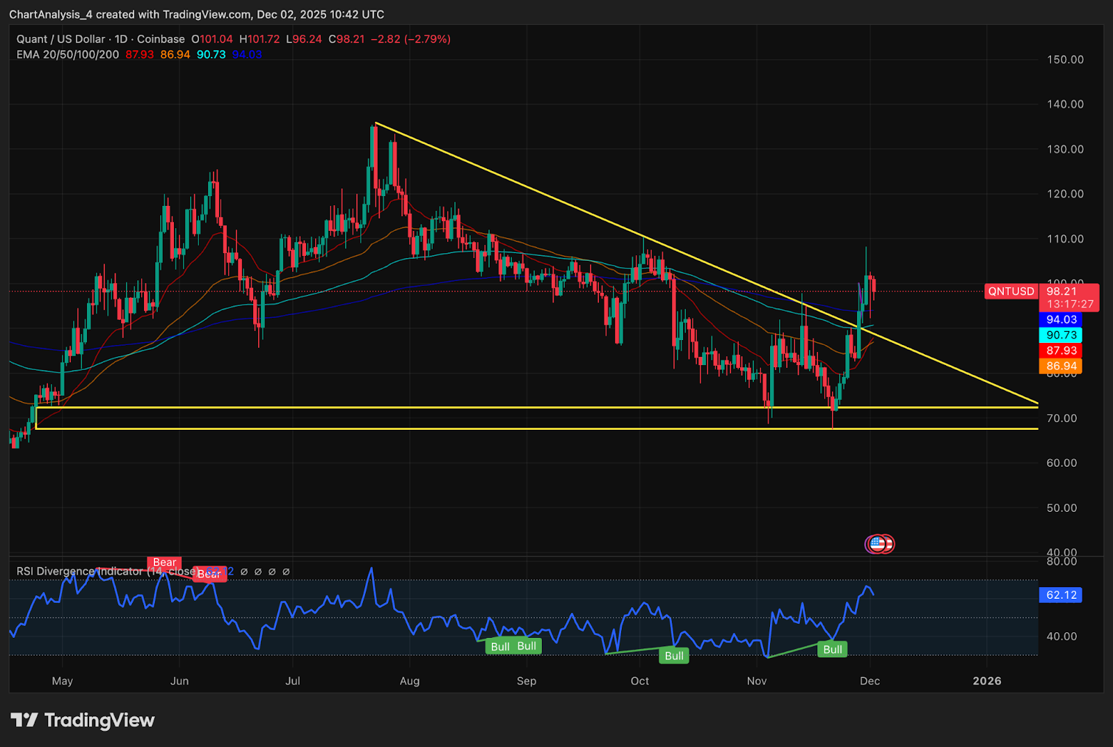 - Quant price today trades near $98 after rejection above $100 and $105 supply zone.