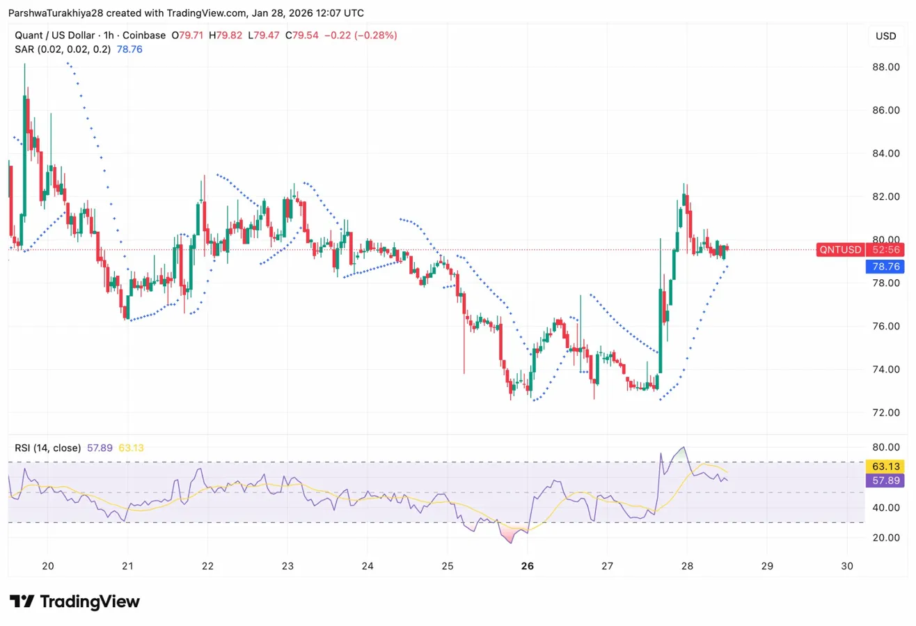 Shorter timeframes reveal the bounce dynamics. On the hourly chart, QNT recovered from a low of $73 on January 26 to test $80 resistance. The Parabolic SAR flipped bullish at $78.76 and now sits just below current price.