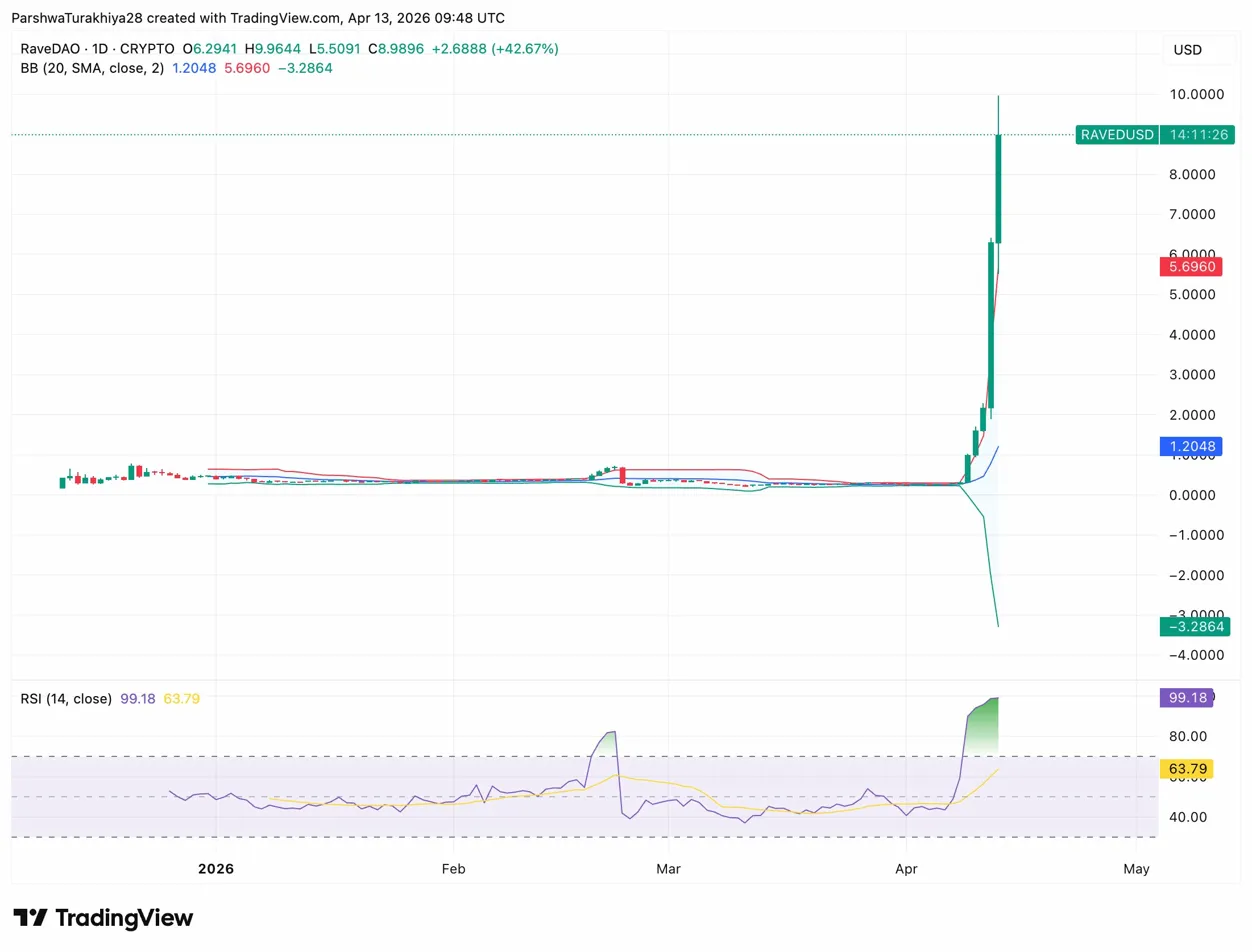 - RAVE trades at $8.98, up 42.67%, with RSI at 99.18 and price trading $3.30 above the upper Bollinger Band at $5.69.