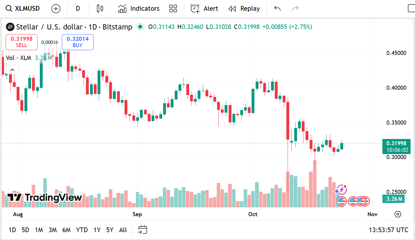 Stellar (XLM) continues to be robust in the payment segment. The cryptocurrency is quoted at $0.3199, which is 2.99% above in the past 24 hours, with a market capitalization of $10.29 billion. The volume over the past 24 hours is down by 13.48% at $172.61 million, a sign that investors are taking positions after the recent market fluctuations.