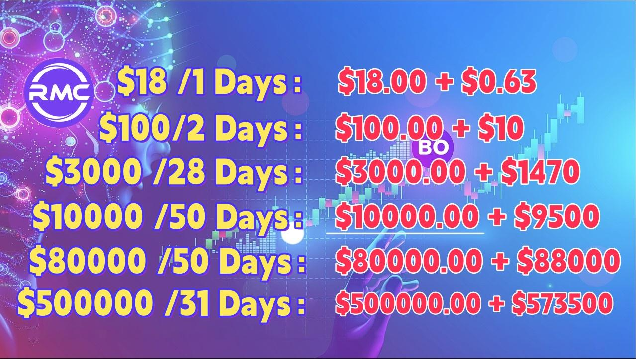 Currently, RMC MINING also offers a variety of mining contract options, such as a $100 trial contract, a 2-day contract that expires and you can apply for withdrawal to familiarize yourself with our mining process, an $800, 7-day short-term contract that allows you to make reasonable investments based on your own financial situation, and a $500,000, 31-day contract that is the best investment contract, allowing investors to (double their monthly income). Each contract has a unique return on investment (ROI) and a specific contract period.