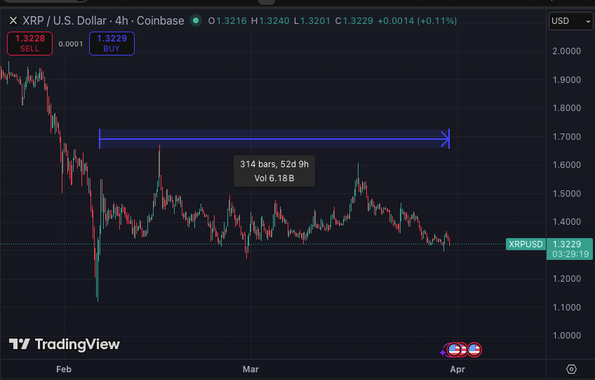One analyst noted that since XRP bottomed on February 6th, it has been trading sideways for 52 days, while another, ChartNerd, added that this compression signals an upcoming move for XRP.