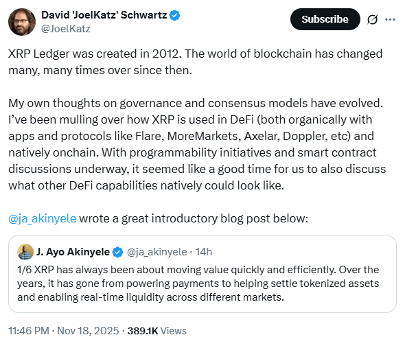 The move follows the launch of the first XRP spot ETF by Canary. Schwartz said that the blockchain world has changed since XRPL’s debut and developers now need to reconsider long-held assumptions about governance, incentives, and how value should flow across the network.