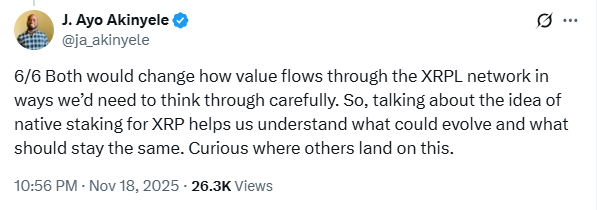 While staking is typically used to align economic incentives between validators and token holders, XRPL operates differently. Transaction fees are burned. Validators have equal influence regardless of token ownership. Any introduction of staking would therefore represent a major shift.