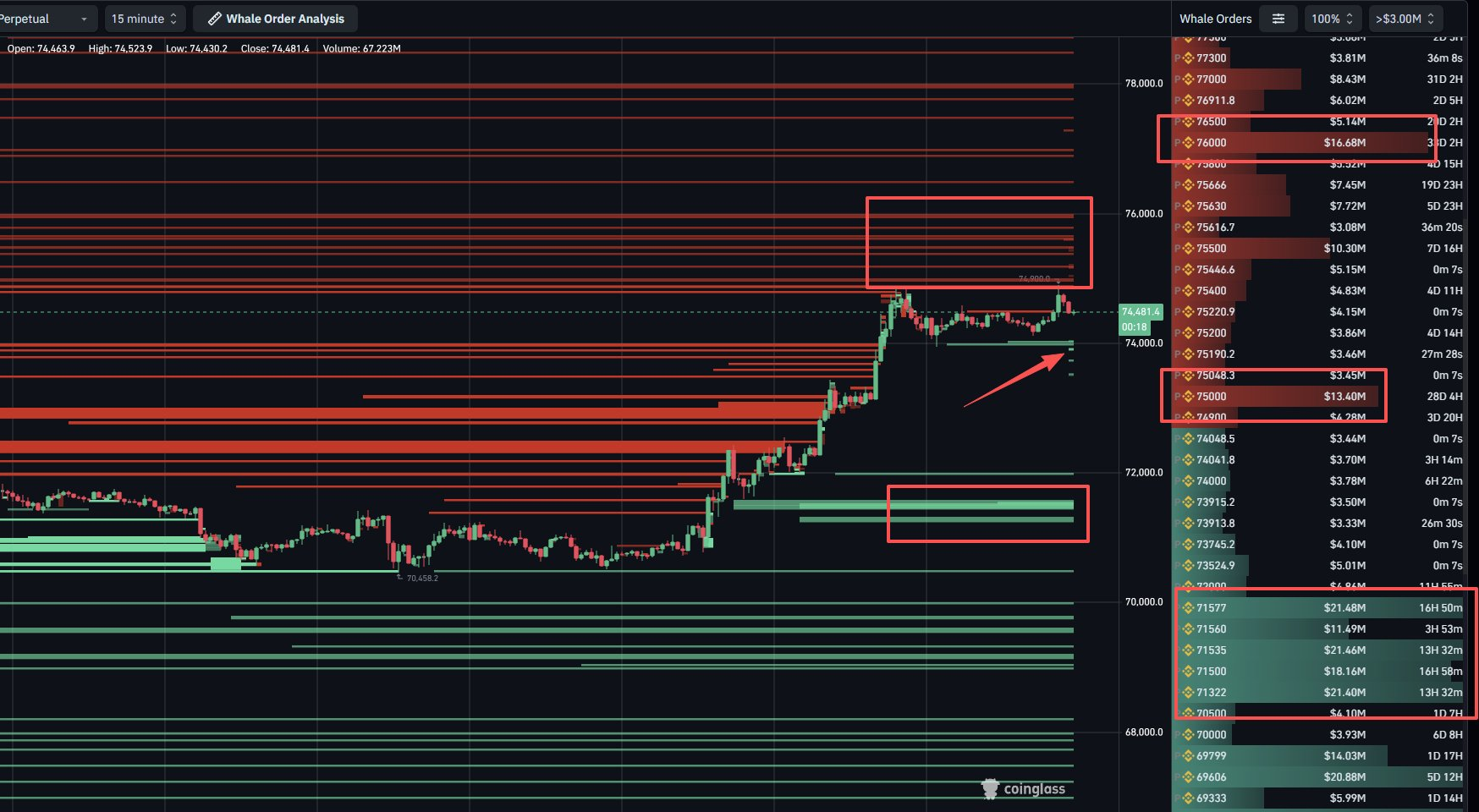 Отдельно данные CoinGlass показывают формирование чёткой структуры ликвидности. Это включает сильное давление на продажи в диапазоне от $75,000 до $76,000, а сильная поддержка ставок нарастает около $71,500.