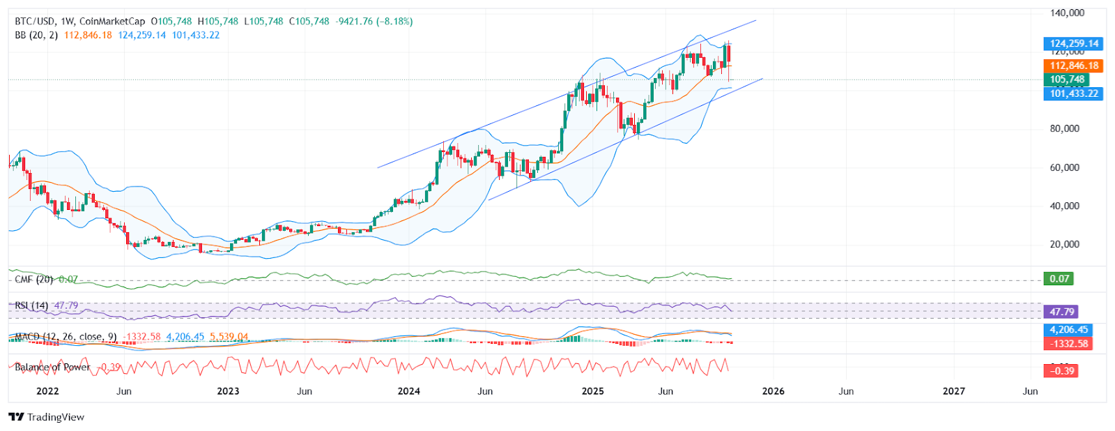 Недельный график сохраняет восходящий канал, направляющий восходящий тренд с начала 2023 года. Уровень сопротивления расположен вблизи отметки $124 000–$125 000. Основной уровень поддержки находится на уровне $100 000, а зона риска обозначена на уровне $88 000–$90 000 вдоль нижней границы канала.
