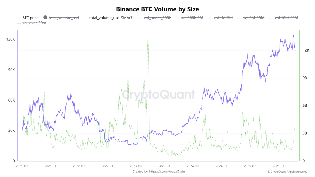 Данные Binance показали, что семидневный средний объём торгов близок к самому высокому значению с марта, сейчас он составляет около 3,68 млрд долларов, что соответствует показателю повторного накопления, когда цена снижается, а активность нарастает. Согласно этой схеме, следующее решение о направлении торгов будет принято в зоне от 100 000 до 105 000 долларов, поскольку трейдеры отслеживают, как спрос поглощает предложение.