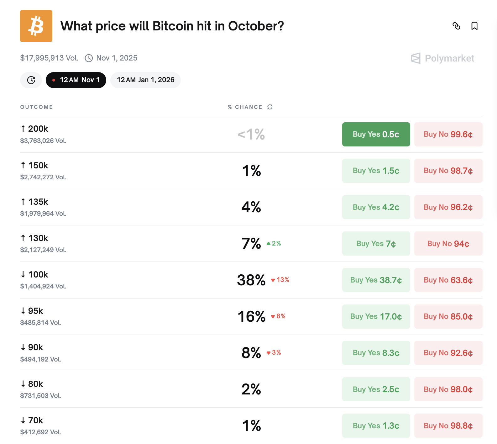 Данные Polymarket о рынке прогнозов указывают на медвежий настрой спекулянтов. Наиболее вероятное событие теперь составляет 38% вероятности того, что биткоин к концу октября упадёт ниже $100 000, в то время как лишь 7% ставок предполагают рост выше $130 000.