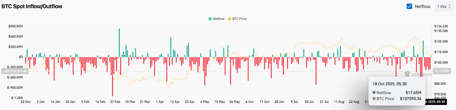 После чистого оттока почти в 1,6 млрд долларов США за последние пять дней данные Coinglass показывают скромный чистый приток в размере 17,6 млн долларов США 18 октября, что означает первый положительный день за неделю.
