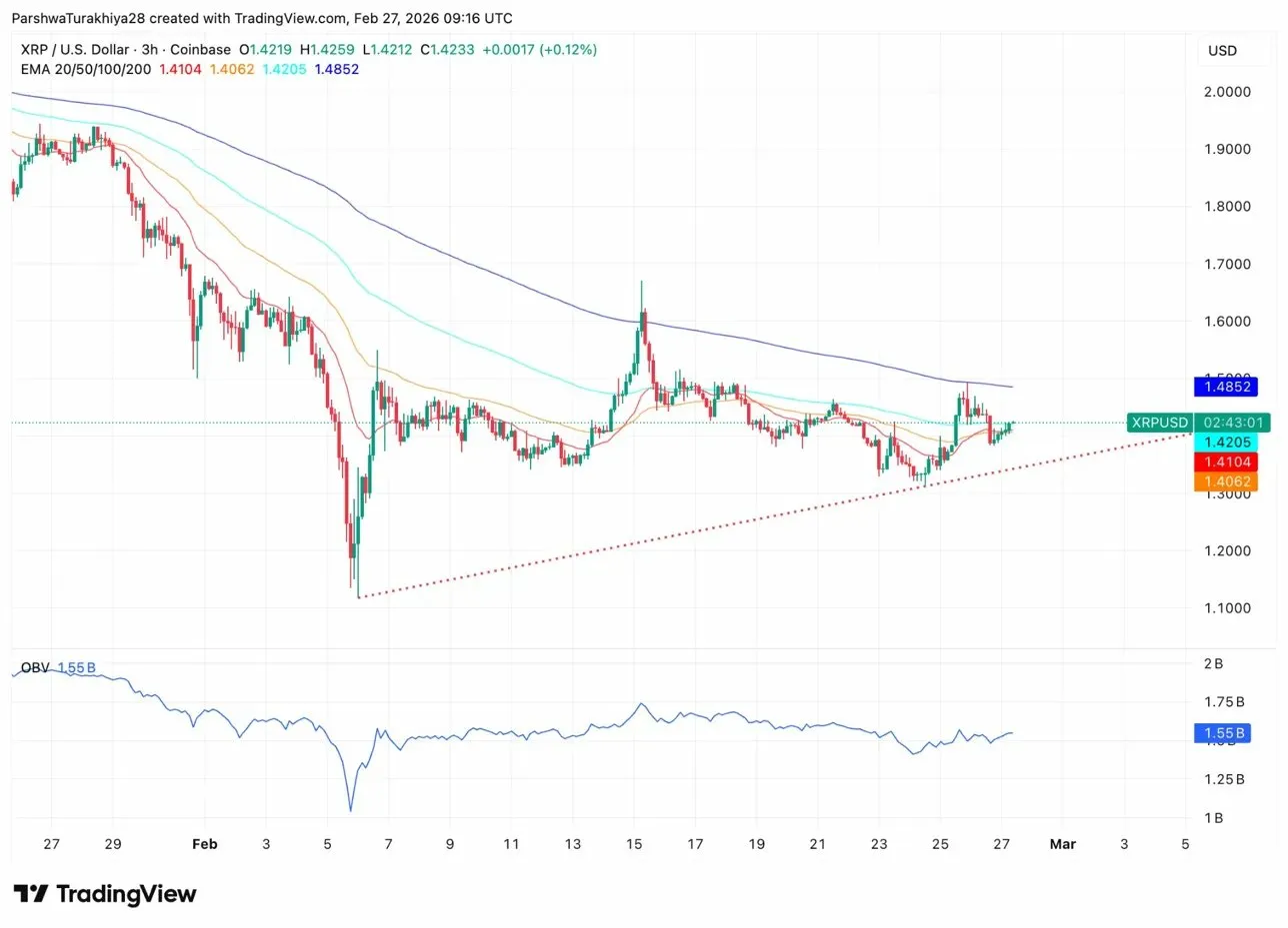Трёхчасовой график показывает, как XRP торгуется выше всех четырёх EMA впервые за несколько недель. 20-дневная EMA на уровне $1.41, 50-дневная EMA на $1.40, 100-дневная EMA на $1.42 и 200-дневная EMA на $1.48 теперь накапливаются в бычьей конфигурации на более низких таймфреймах.