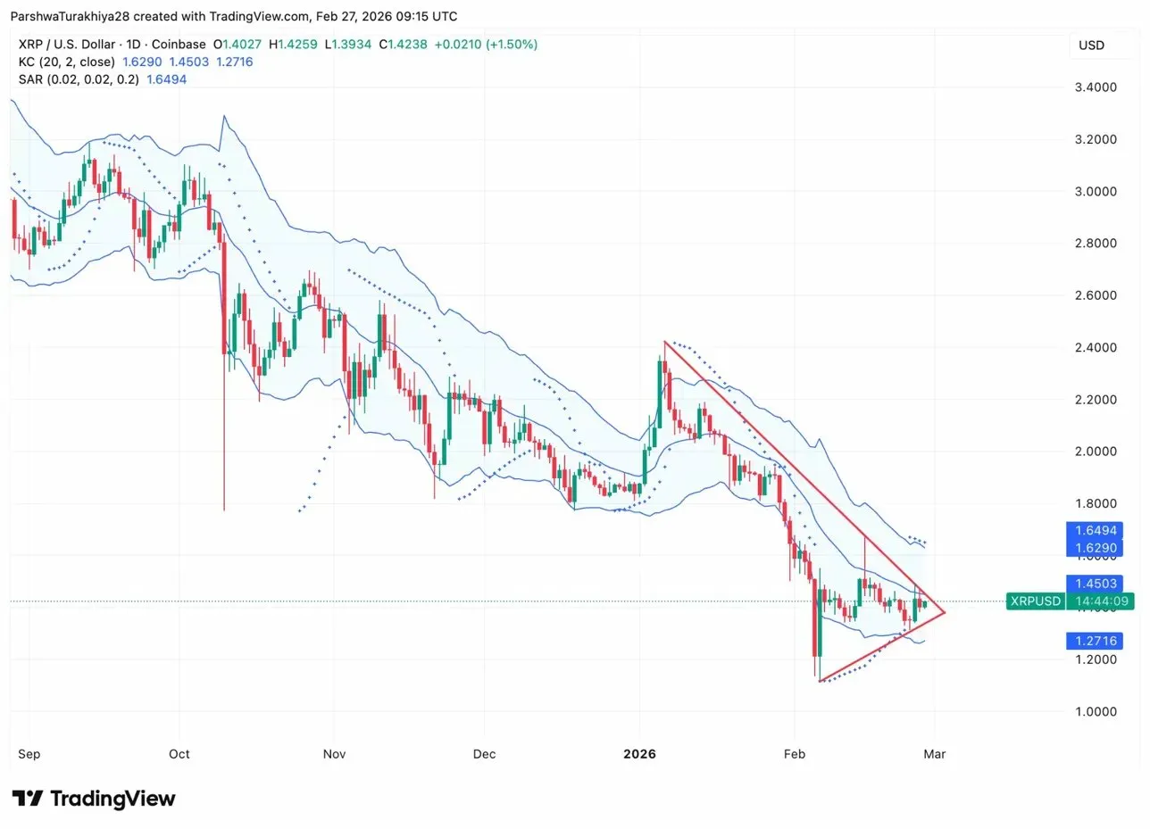 - XRP пробивает нисходящую клиновую схему, торгуется около $1.42 после отскока от поддержки $1.27 на фоне сдвига технической структуры бычьей формы.