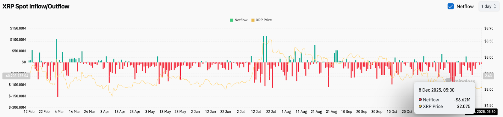 Согласно последним данным, 8 декабря XRP зафиксировал чистый отток более $6,6 миллиона, продлив серию негативных сессий, продолжающуюся несколько недель.