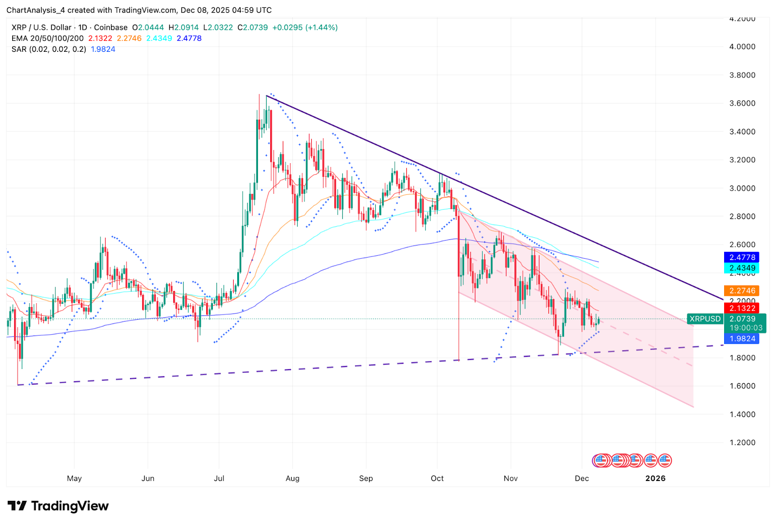 Цена XRP сегодня торгуется около $2.07, стабилизировавшись после волатильной недели, которая продолжила более широкий нисходящий тренд. Цена остаётся ограниченной под долгосрочной нисходящей трендовой линией, находясь внутри падающего канала, который определил недавнюю структуру. Продавцы продолжают оказывать давление на попытки восстановления, поскольку спотовые потоки остаются отрицательными, а ключевые скользящие средние превращаются в сопротивление.