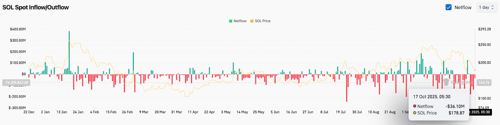 Данные биржи Coinglass указывают на устойчивый отток капитала из Solana за последнюю неделю. 17 октября сеть зафиксировала чистый отток в размере 36,1 млн долларов США, что стало продолжением трёхдневного совокупного оттока, превысившего 400 млн долларов США.