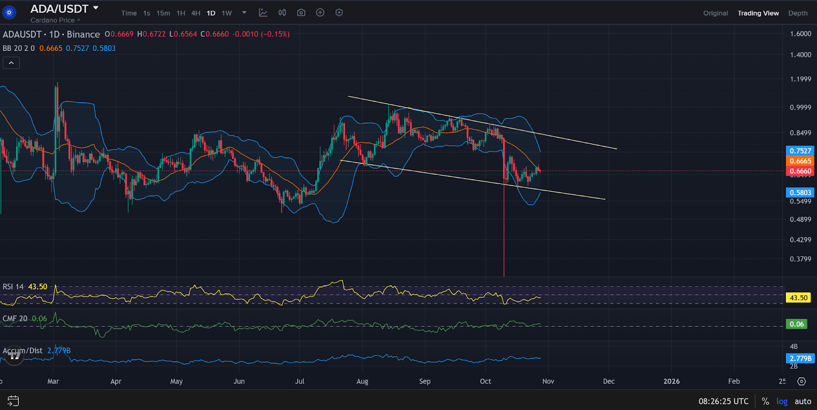На дневном графике ADA продолжает торговаться в нисходящем канале между $0,58 и $0,75. Цена колеблется вблизи середины диапазона на уровне $0,666, при этом индекс относительной силы (RSI) составляет 43,5, что указывает на умеренное медвежье давление. Денежный поток Чайкина (CMF) остаётся нейтральным на уровне 0,06.