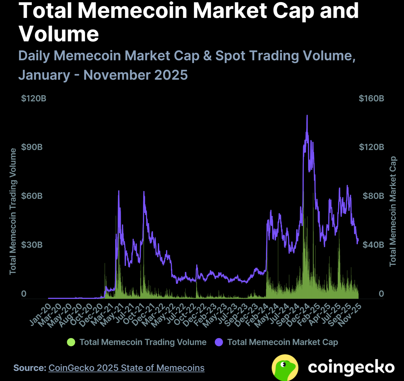 Однако в 2025 году общий интерес к мем-монетам резко снизился, сообщил CoinGecko. Общий процент снизился на 81,6% по сравнению с началом года. Общая рыночная стоимость мем-коин также снизилась примерно до 47,2 миллиарда долларов к ноябрю 2025 года.