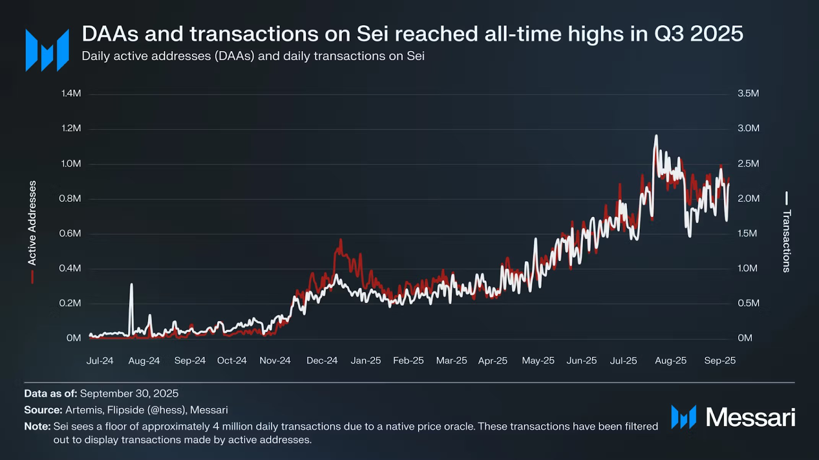 Sei зафиксировала пятый подряд квартал роста сети в третьем квартале 2025 года. Среднее количество ежедневных активных адресов выросло на 93,5% за квартал к кварталу и достигло 824 000, а ежедневные транзакции выросли на 87,1% и достигли примерно 2 миллионов, согласно данным Messari.