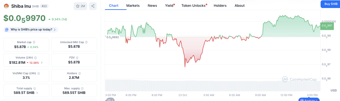 Цена сиба-ину на момент публикации составляла $0,000009970, что на 0,34% больше, чем в день, согласно данным CoinMarketCap. Несмотря на рост, объём торгов снизился на 12,38% до $182,81 млн, что свидетельствует о снижении активности после недавней волатильности. Рыночная капитализация токена составила $5,87 млрд, что соответствует его полностью разбавленной стоимости из-за практически полного обращения.