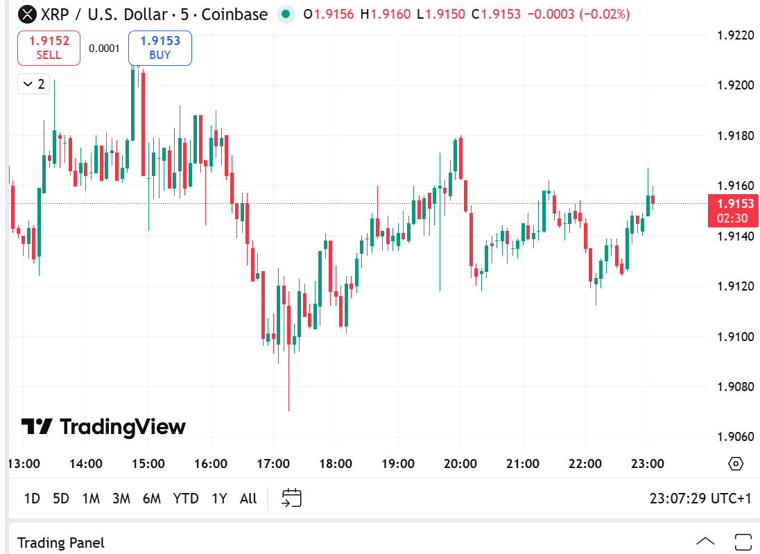 В настоящее время XRP оценивается в $1,91, что на 0,02% ниже, с рыночной капитализацией $116,56 миллиарда. Ежедневный объём торгов снизился до $1,13 миллиарда, что на 52,92% снижение, отражающее ослабление импульса в крупных компаниях.