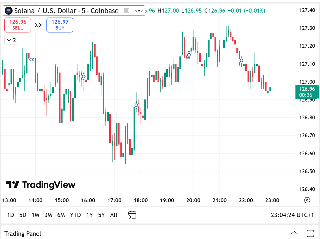 Цена Solana, тем временем, котируется на уровне $126,96 с потерей 0,12% за последние 24 часа. Её капитализация составила $71,87 миллиарда, а текущий объем торгов снизился на 54,82% до $1,69 миллиарда, что указывает на сокращение краткосрочной активности, а не на принудительные продажи.