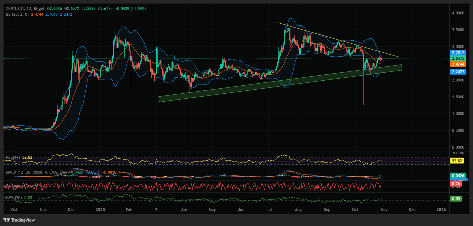 На момент написания статьи курс XRP торгуется вблизи $2,65, отскочив от зоны поддержки $2,0. График демонстрирует постепенное восстановление после резкого падения в начале этого месяца. Нисходящая линия тренда, сдерживавшая рост с июля, продолжает выступать основным сопротивлением вблизи диапазона $2,70–$2,80.