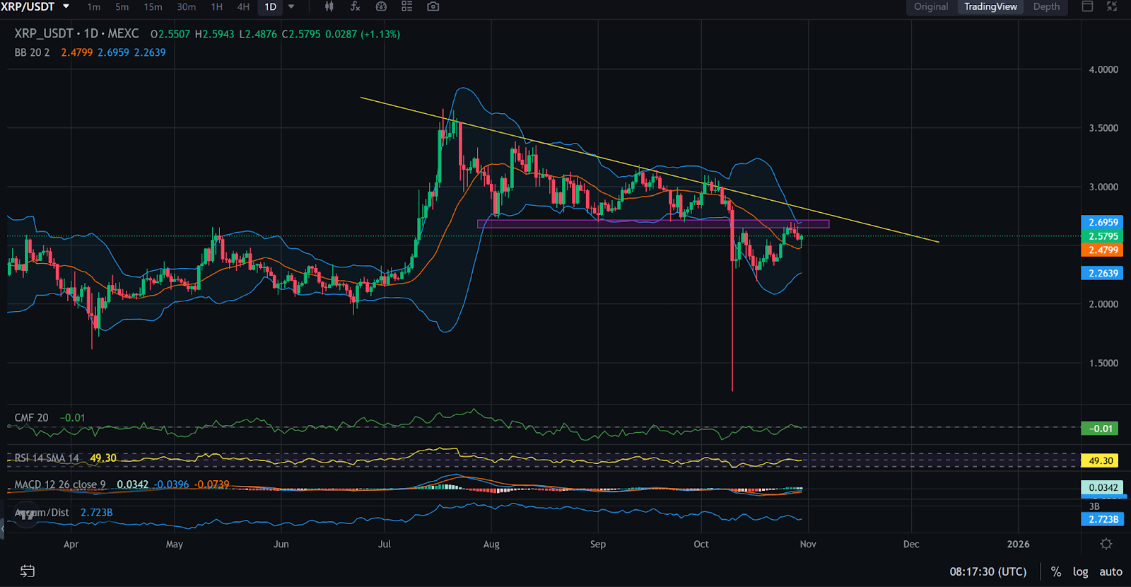 XRP торгуется около $2,58, увеличившись на 1,4% за последние 24 часа. На дневном графике видно, что XRP тестирует долгосрочную нисходящую линию тренда, которая сдерживала рост с июля. Решительное закрытие выше $2,69–$2,70 (верхняя полоса Боллинджера) может открыть путь к прорыву к $3,00 и, возможно, к $3,20, если импульс сохранится.