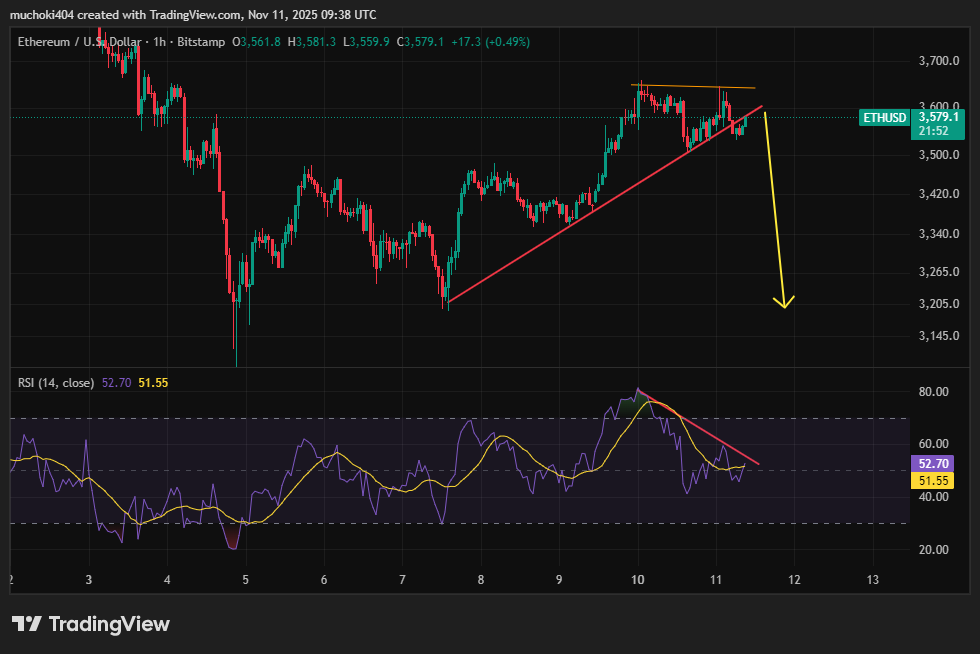 In the 1-hour timeframe, the ETH/USD pair has been forming a potential double top, coupled with bearish divergence of the Relative Strength Index (RSI). The ETH/USD pair also dropped below its recent rising logarithmic trend, signaling more pain ahead.