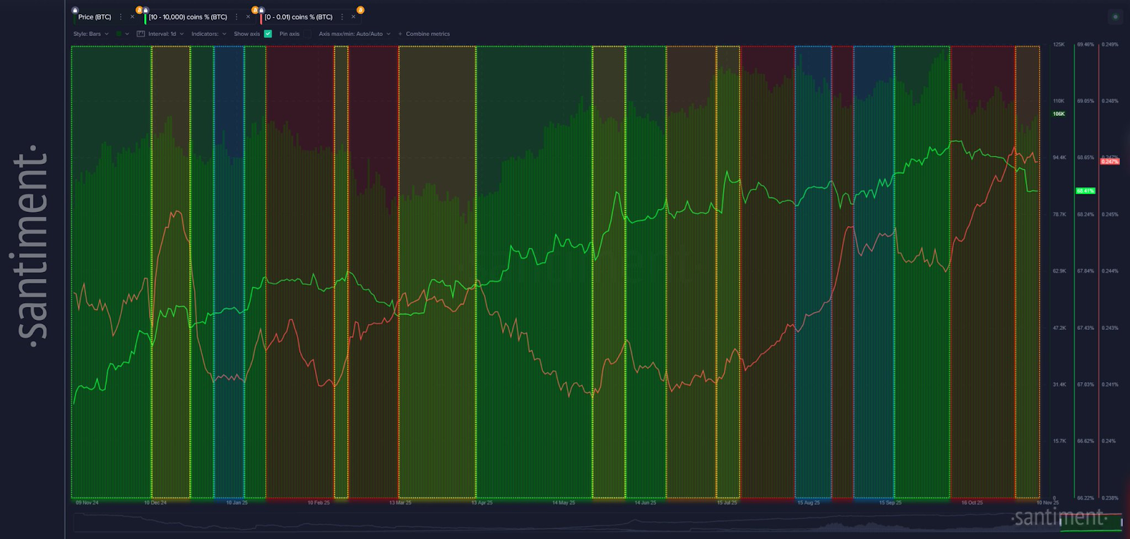 The latest Santiment dashboard shows something traders don’t like to see at the end of a selloff: Bitcoin wallets holding 10 BTC to 10,000 BTC are reducing exposure at the same time as small holders, which means capitulation pressure is still active, not finished.