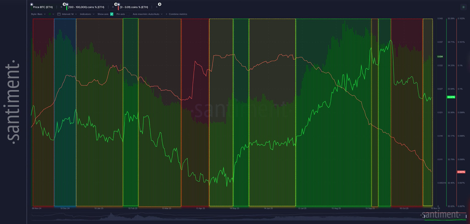 Santiment’s new index for Ethereum shows the same two-sided reduction: wallets with 100 ETH to 100,000 ETH have been sending coins back to exchanges, and the smallest wallets below 0.01 ETH have been cutting exposure since July 2025.