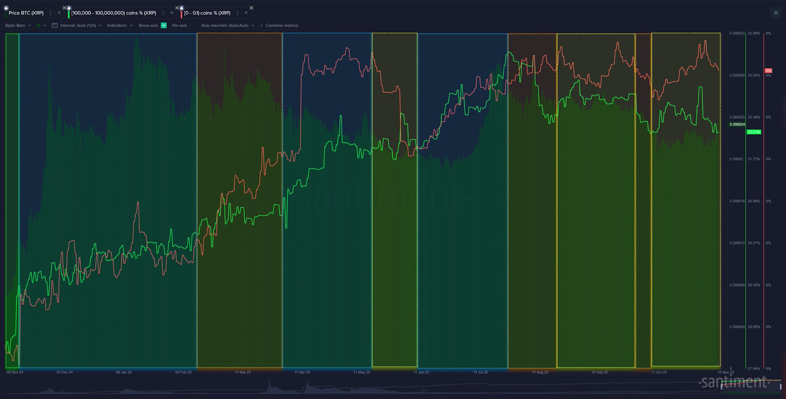 XRP is the outlier in this setup. Santiment shows the earlier aggressive XRP accumulation has slowed and both whales and retail trimmed this week, which is why XRP slid into a midterm correction.