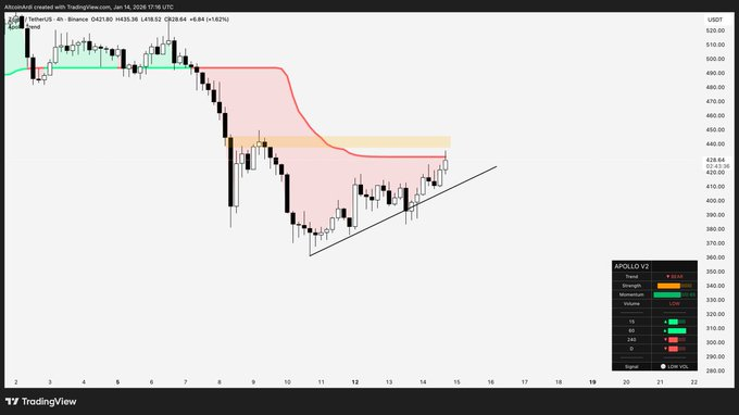 One analyst said Zcash (ZEC) is pushing back toward the $450 resistance level, supported by a rising trendline and improving momentum indicators.