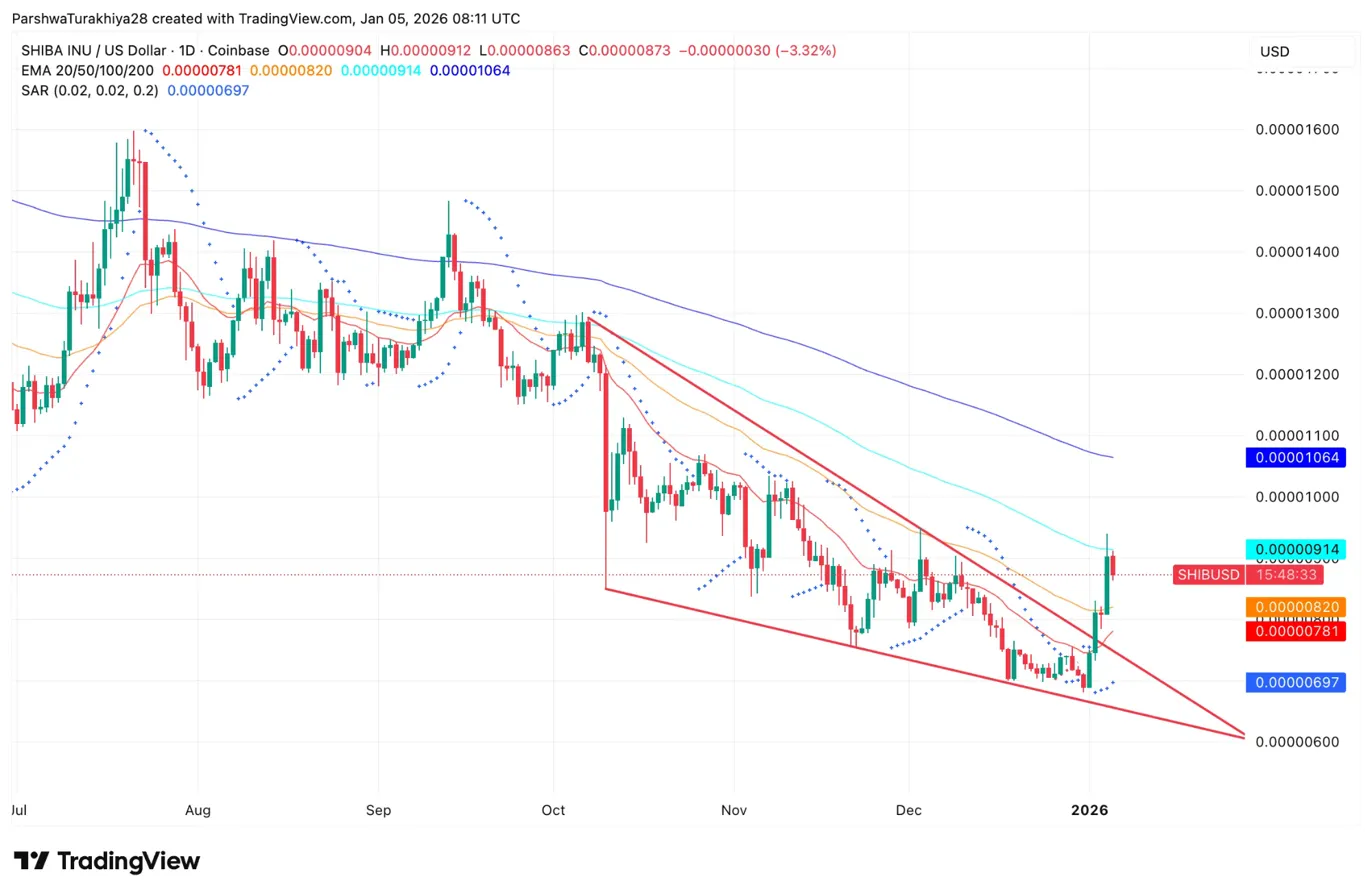 SHIB at $0.00000873 trades in descending channel from August’s $0.00001650 highs. EMAs at $0.00000781/$0.00000820/$0.00000914/$0.00001064 show mixed signals.