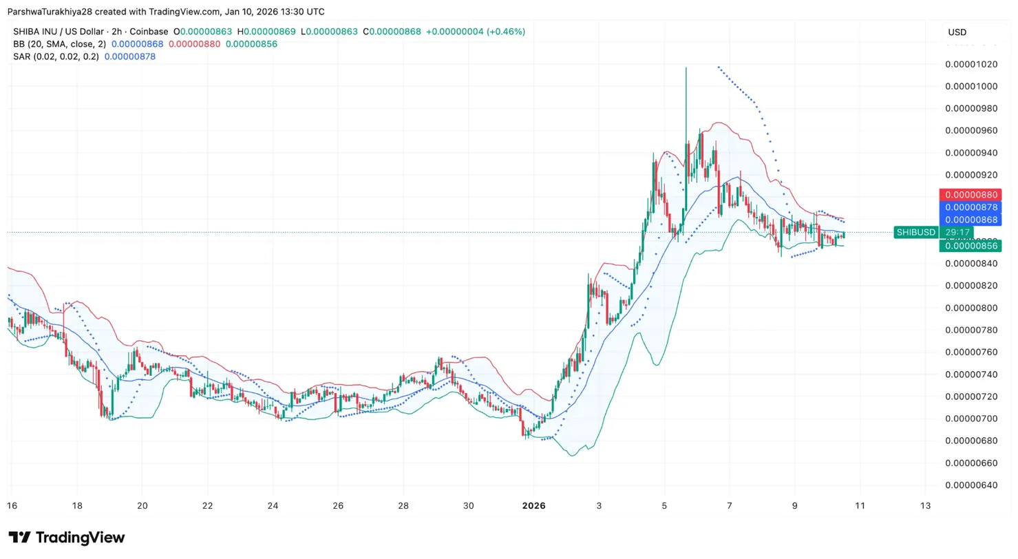 The 2-hour timeframe shows SHIB consolidating near the middle Bollinger Band at $0.00000868 after the sharp rally exhausted at $0.00001020. Price is now testing this level as support, with the lower band at $0.00000856 providing the next floor.
