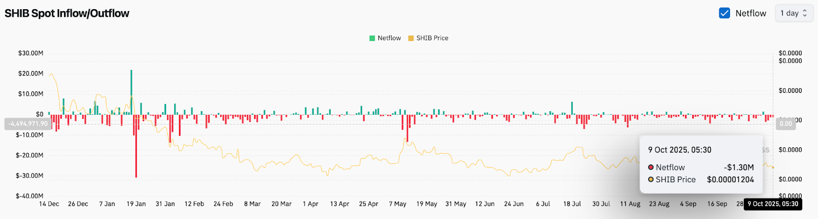 Overall, the SHIB price action remains range-bound, with traders eyeing confirmation from on-chain flows before betting on a breakout. Sustained positive net inflows above $10 million would be the first sign of returning conviction.