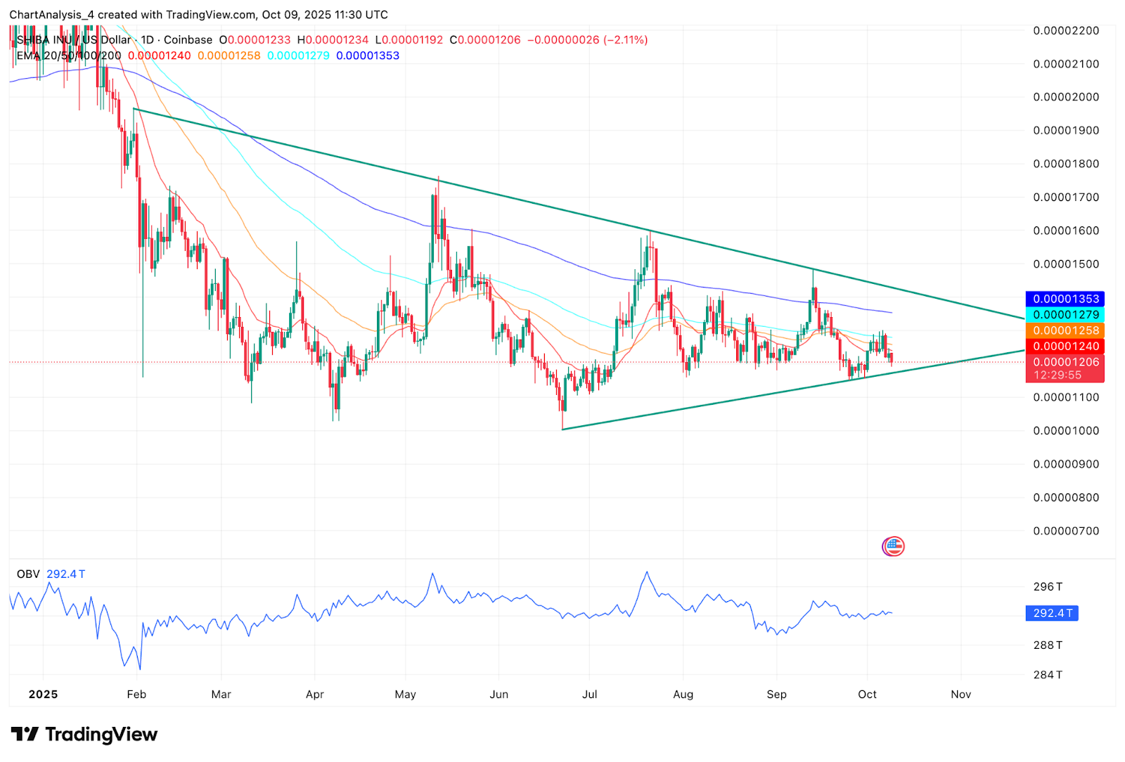 The daily chart shows SHIB consolidating between $0.00001190 and $0.00001350, forming a classic symmetrical triangle pattern that has defined most of its 2025 trajectory. The 20-day EMA sits near $0.00001240, overlapping with the lower boundary of the triangle and providing short-term structural support.