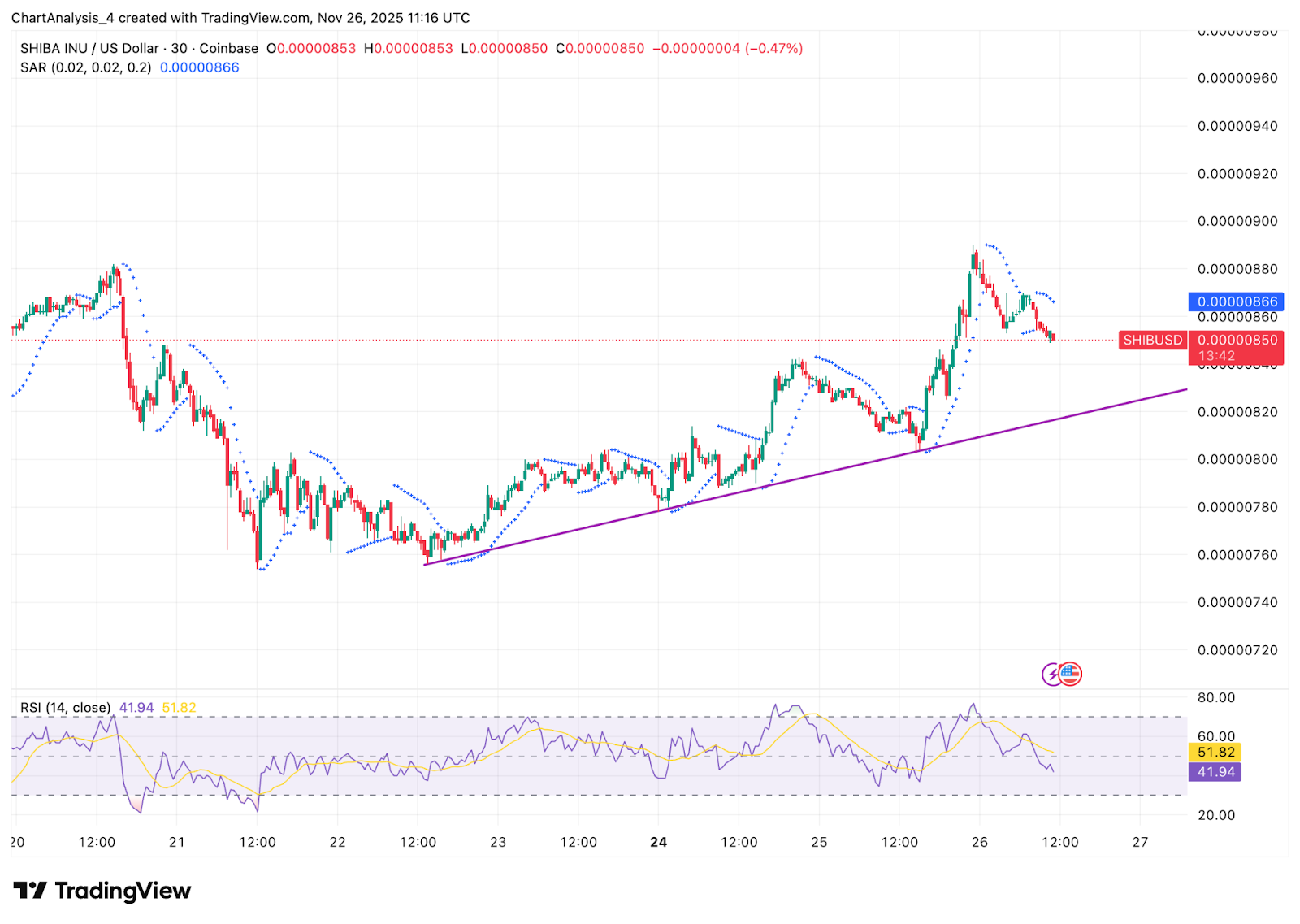 The 30 minute chart shows SHIB forming a rising support line from the November low near $0.0000076. This creates an intraday uptrend inside the broader downtrend, a structure that often signals temporary stabilization. Price touched $0.00000886 earlier today before pulling back to the current level.