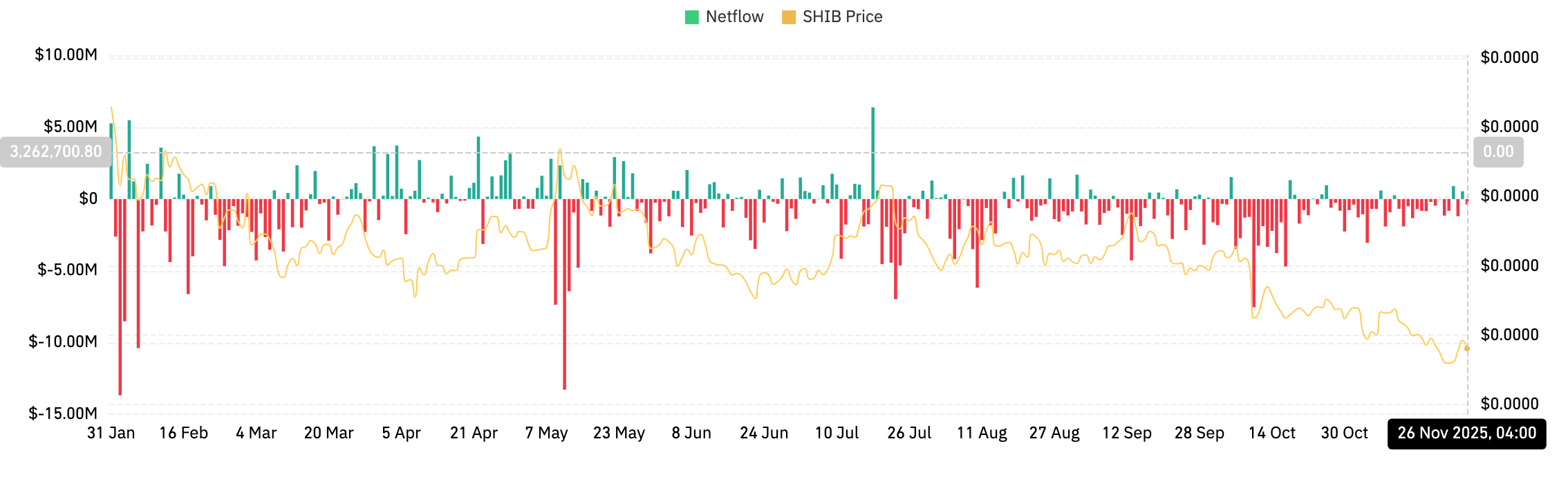 Coinglass data shows $380,000 in net outflows on November 26. While smaller in scale compared to large cap assets, the consistent pattern is clear. Red prints have dominated SHIB’s flow chart for most of the past three months.