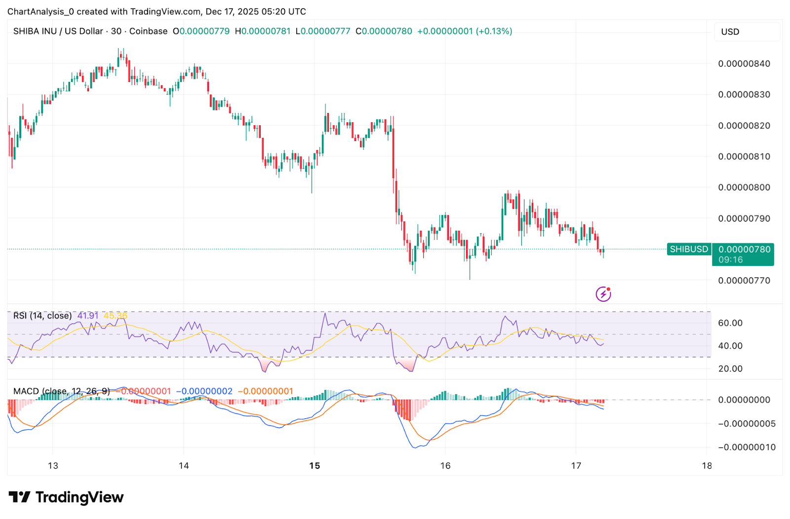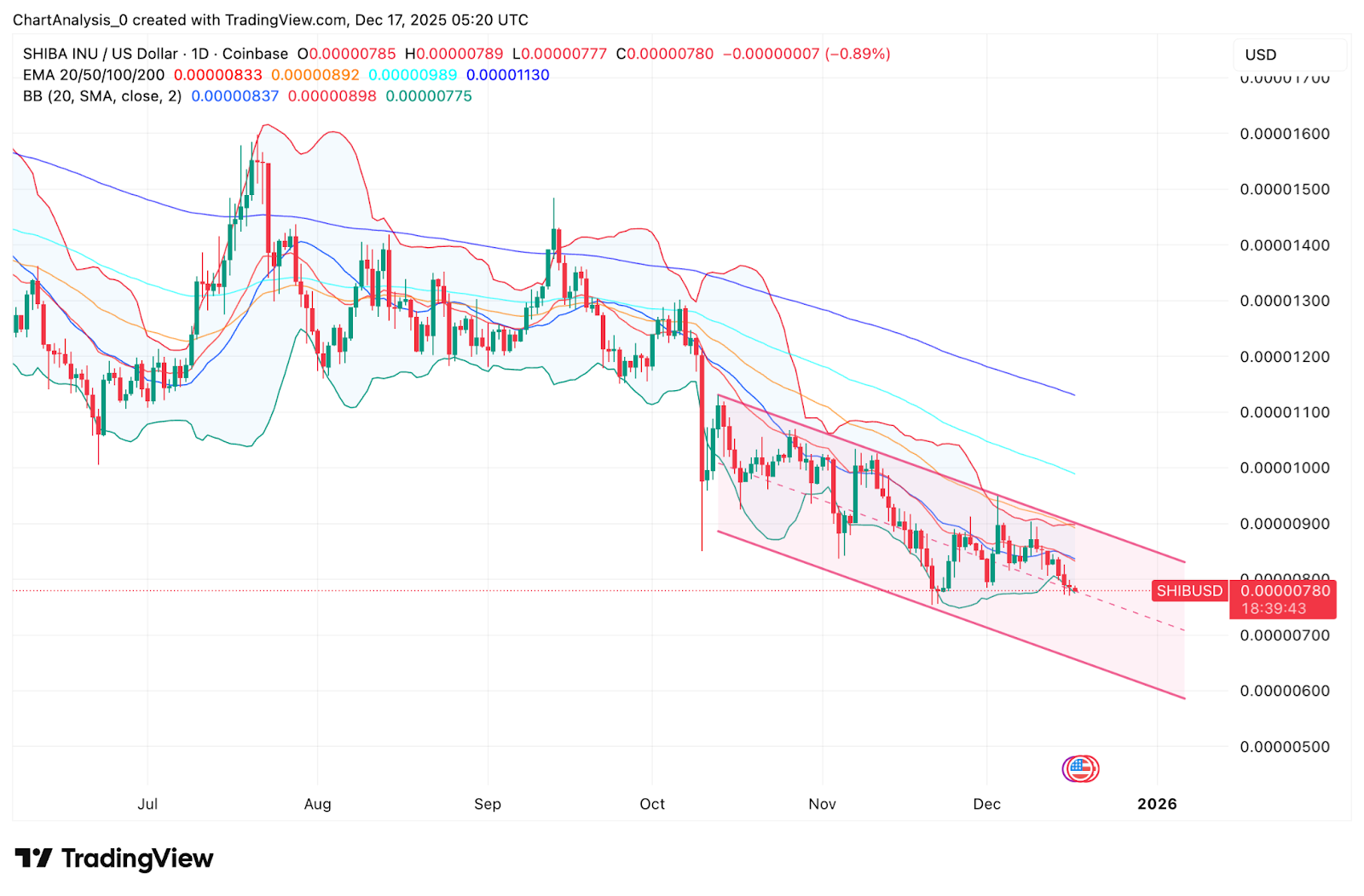 Shiba Inu price today trades near $0.00000780, slipping modestly after another failed attempt to reclaim short-term resistance. The token remains pinned near the lower boundary of a descending channel, with sellers controlling trend structure while buyers defend a narrow support band that has held through December.