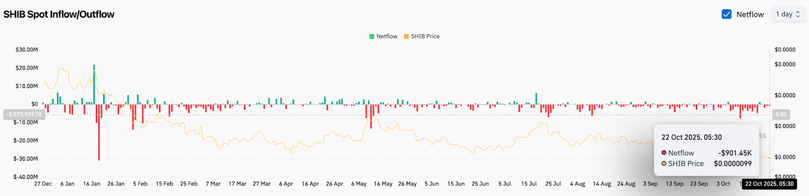 Exchange flow data paints a less supportive picture. According to Coinglass, SHIB saw a net outflow of roughly $901,000 on October 22. While outflows can often support price by reducing sell-side liquidity, the scale remains relatively modest compared with past accumulation phases.