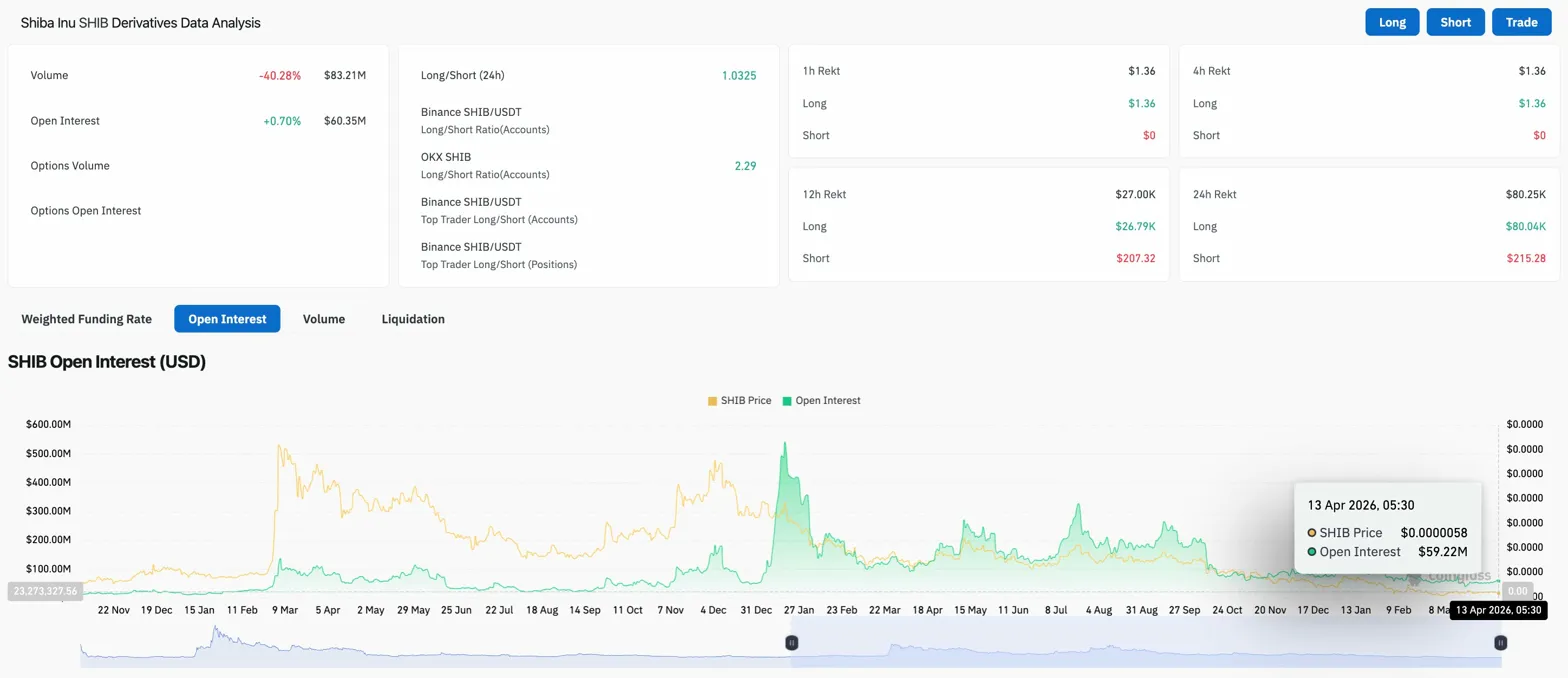 Volume fell 40.28% to $83.21M while OI rose 0.70% to $60.35M. Positions are holding, not closing. Long/short ratio at 1.0325 leans slightly long, with OKX accounts sitting heavily long at 2.29.